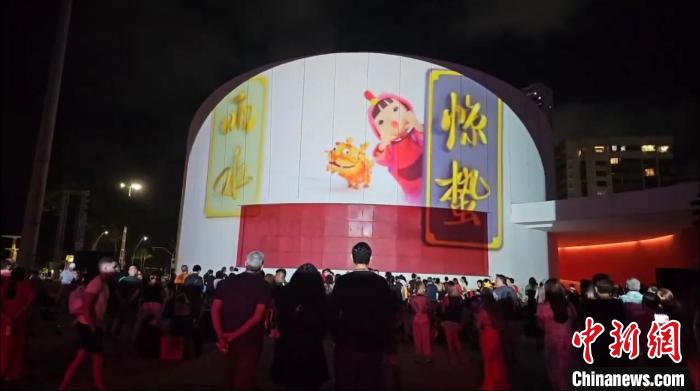 當(dāng)天晚上,多娜·琳杜公園內(nèi)劇院的外墻,投影出中國文化元素?zé)艄庑?。畫面中,十二個(gè)生肖福娃次第給觀眾拜年,中國傳統(tǒng)時(shí)令節(jié)氣習(xí)俗一一展演,格外吸睛。