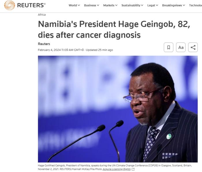 路透社稱,納米比亞共和國總統(tǒng)社交媒體賬號(hào)并未解釋該國總統(tǒng)去世的原因,但哈格·根哥布上月底曾表示,自己被診斷出患有癌癥,將前往美國治療。