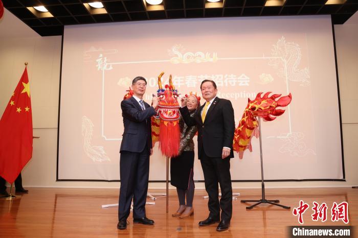 當(dāng)?shù)貢r間2月1日晚,加拿大首都渥太華,中國駐加拿大大使館舉行2024年春節(jié)招待會。圖為中國駐加拿大大使叢培武(左)與加拿大聯(lián)邦參議員胡子修共同為舞龍點(diǎn)睛。中新網(wǎng)記者 余瑞冬 攝