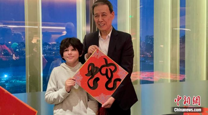 中國(guó)書(shū)法家修先臺(tái)先生向法國(guó)小男孩贈(zèng)送書(shū)法作品。中新網(wǎng)黃方攝