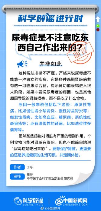 中新網(wǎng)2月7日電 近日有人稱:“中國尿毒癥透析患者已經(jīng)超過100萬了,尿毒癥是不注意吃東西自己作出來的,要想不得尿毒癥,有些食物不能碰……”注意,這些說法沒有科學(xué)依據(jù)!嚴(yán)格來說尿毒癥并不能算一種獨(dú)立的疾病,它是各種晚期腎臟病共有的一組臨床綜合征,提示腎功能衰竭進(jìn)入終末階段。如果非要說尿毒癥的病因的話,也是其他原因?qū)е碌哪I臟損害,而不是吃了什么食物。要想保護(hù)腎臟,更重要的還是養(yǎng)成健康的生活習(xí)慣,并定期體檢。(來源:@科學(xué)辟謠 中國新聞網(wǎng)微博)