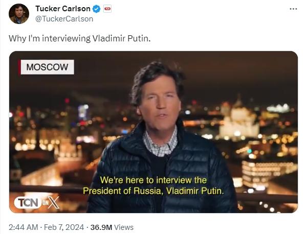 據(jù)介紹,卡爾森是??怂闺娨暸_的一名當紅主播,主要負責一檔名為《卡爾森今夜秀》的新聞節(jié)目。他在2023年4月被??怂菇夤停S后在社交平臺X上繼續(xù)發(fā)布采訪節(jié)目。路透社稱,卡爾森2023年8月在X上發(fā)布的對美國前總統(tǒng)特朗普的采訪獲得了上億播放量。