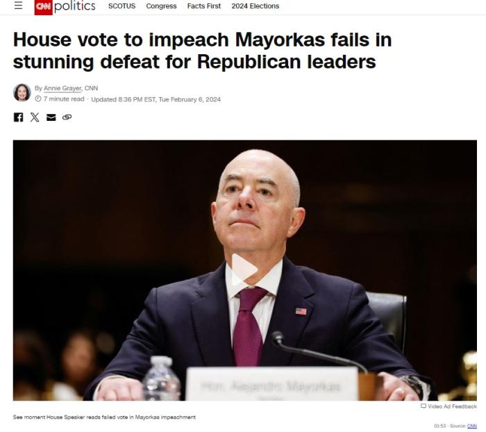 中新網(wǎng)2月7日電 綜合美媒報(bào)道,當(dāng)?shù)貢r(shí)間6日,美國國會(huì)眾議院以214票對(duì)216票的表決結(jié)果,未能通過對(duì)美國國土安全部長馬約卡斯的彈劾案。