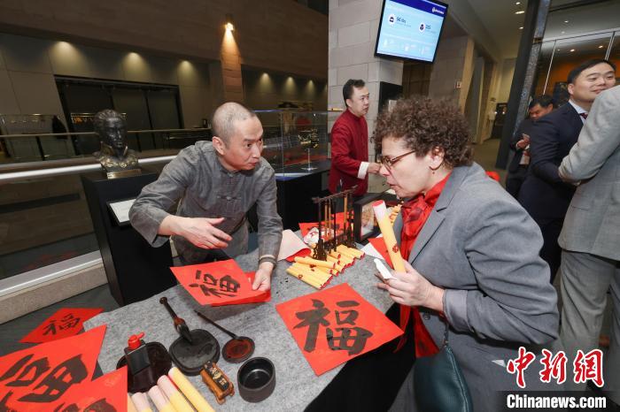 當(dāng)?shù)貢r間2月6日晚,加拿大蒙特利爾,中國駐蒙特利爾總領(lǐng)館與中國常駐國際民航組織理事會代表處在國際民航組織(ICAO)總部聯(lián)合舉辦“共慶春節(jié)”主題活動。圖為當(dāng)?shù)厝A人書法家(左)向與會嘉賓講解以中國書法書寫的“?!弊??!≈行律缬浾? 余瑞冬  攝