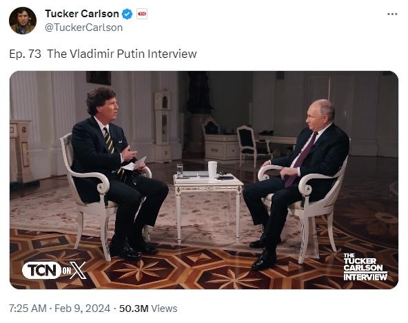 上線前,這場采訪就在世界范圍內(nèi)引發(fā)關(guān)注。有媒體稱,這次采訪或?qū)⒊蔀?022年烏克蘭危機(jī)爆發(fā)后,美國媒體人對普京進(jìn)行的首個(gè)正式訪問。相關(guān)通告已在社交媒體上獲得了網(wǎng)友的上億次瀏覽量。