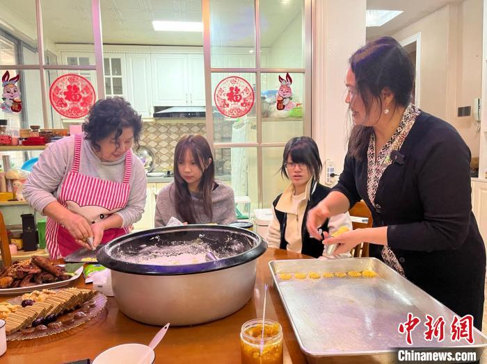2月5日,蔡蘭妹兒媳婦李月瑤(右一)與家人一起制作印尼糕點(diǎn)?! №f佳秀 攝