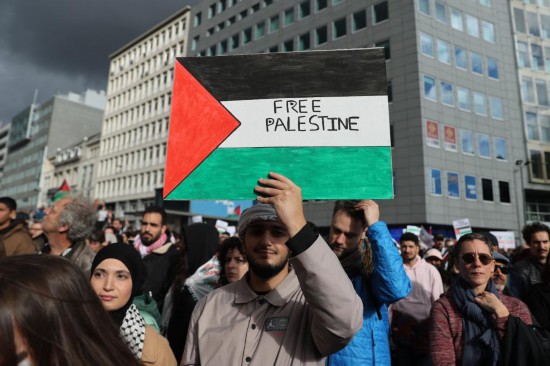 2023年10月22日,示威者在比利時(shí)布魯塞爾歐盟總部附近舉行集會(huì),聲援巴勒斯坦。新華社記者趙丁喆攝