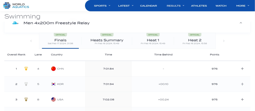 圖為男子4X200米自由泳接力決賽中國隊(duì)成績。圖片來源:世界泳聯(lián)網(wǎng)站截圖