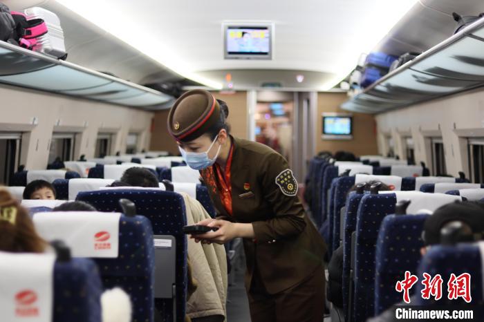 圖為在夜行高鐵上,列車乘務(wù)員掌握旅客到站信息,一對(duì)一進(jìn)行到站提醒。徐雅婷攝