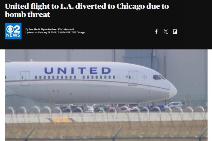 中新網(wǎng)2月22日電 據(jù)美國(guó)哥倫比亞廣播公司(CBS)報(bào)道,當(dāng)?shù)貢r(shí)間21日,美國(guó)聯(lián)合航空公司一架飛往洛杉磯的航班,因收到炸彈威脅,改道飛往芝加哥并緊急降落。目前該航班乘客已被疏散。