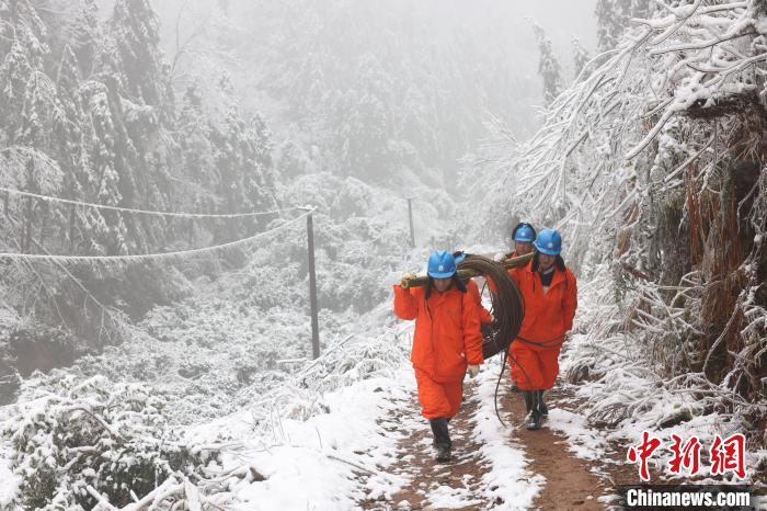 2月8日,國(guó)網(wǎng)浙江電力援湘搶險(xiǎn)隊(duì)員前往平江縣開展搶修作業(yè),扛運(yùn)搶修物資?!±盥勎?攝