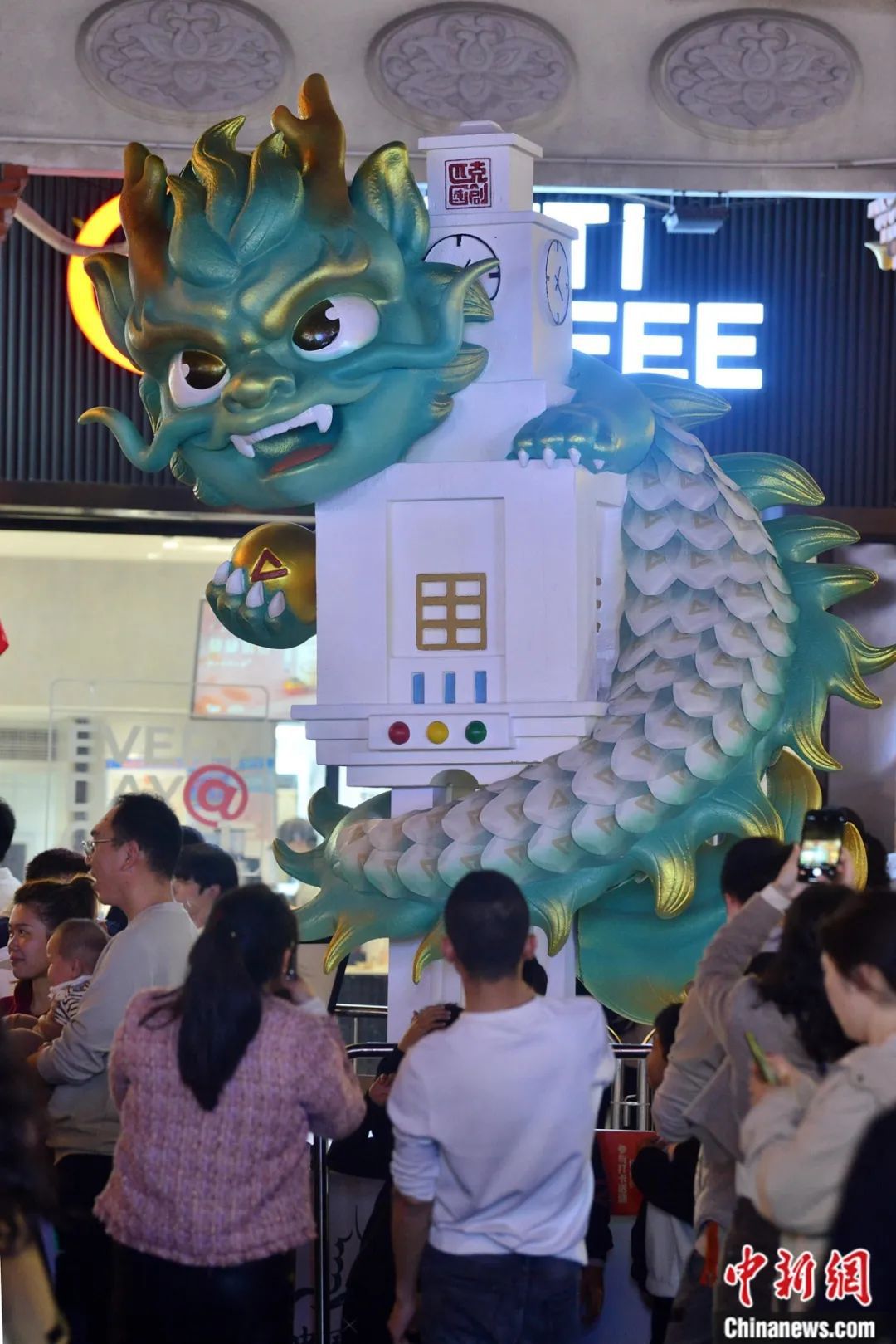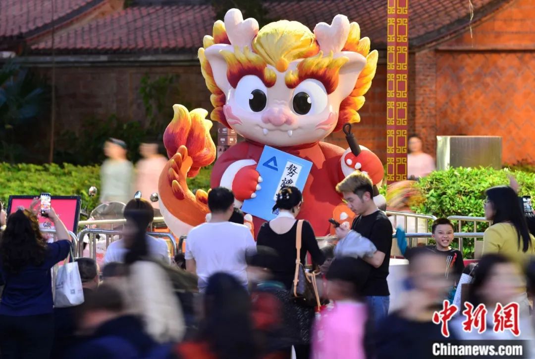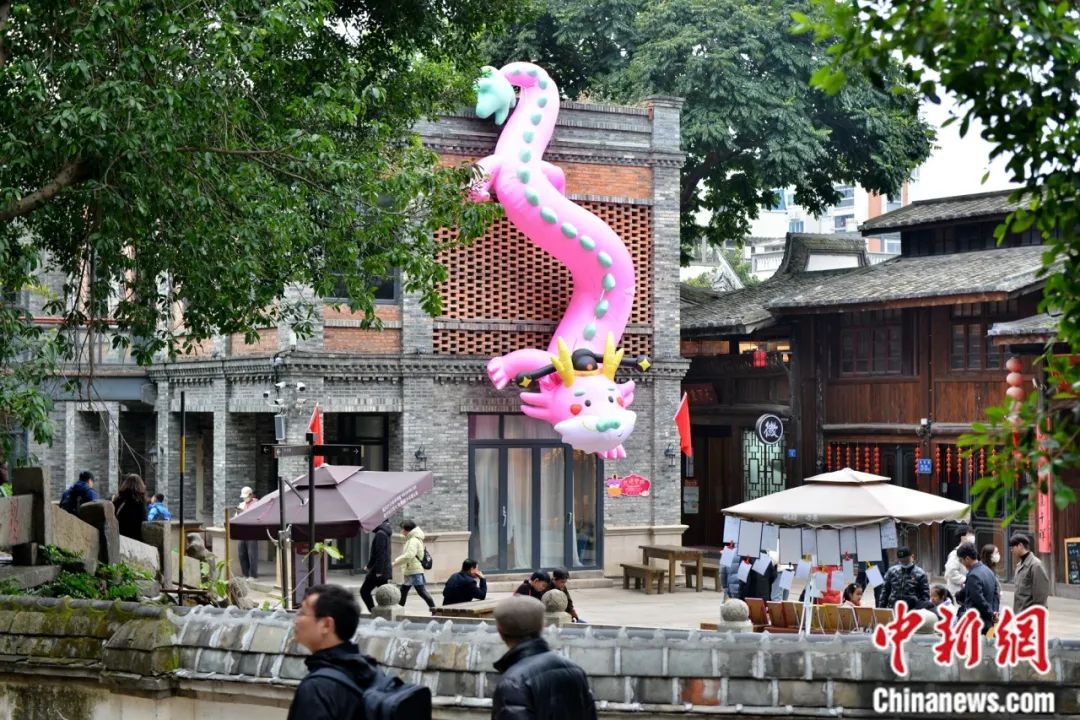 “龍?jiān)亍彼囆g(shù)主題裝置亮相福州上下杭?xì)v史文化街區(qū),活潑的造型與古厝形成鮮明對(duì)比。中新社記者 呂明 攝