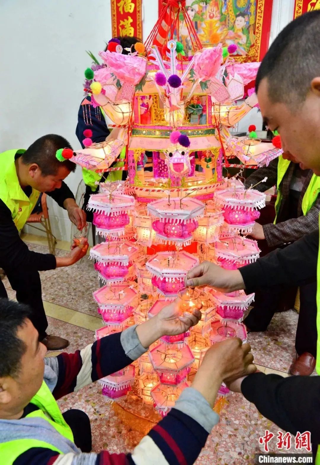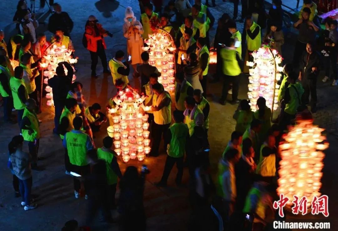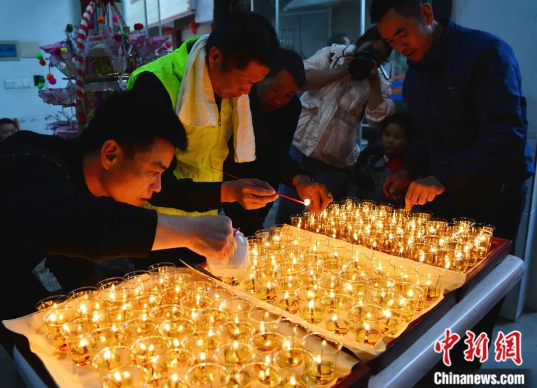 村民正在為花燈裝上油燈。中新社記者 張斌 攝