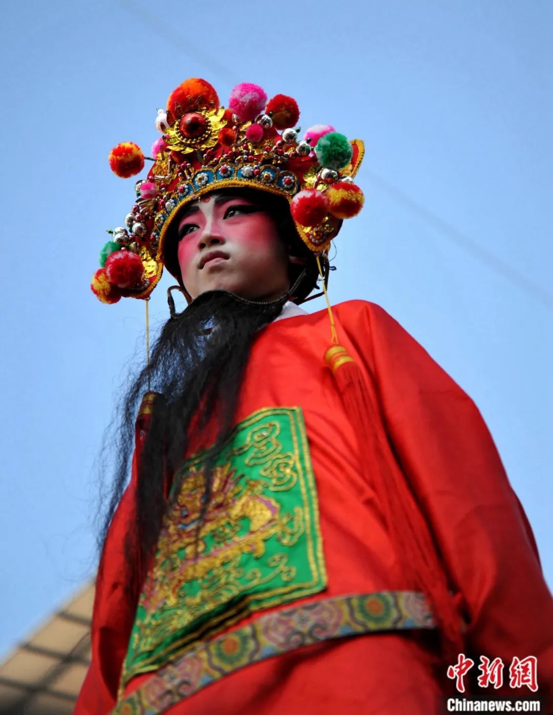 連城縣羅坊鄉(xiāng)舉行國(guó)家級(jí)非物質(zhì)文化遺產(chǎn),享有“中國(guó)客家狂歡節(jié)”美譽(yù)的“走古事”民俗活動(dòng)。圖為立于轎臺(tái)之上參加“走古事”的兒童。中新社記者 張斌 攝