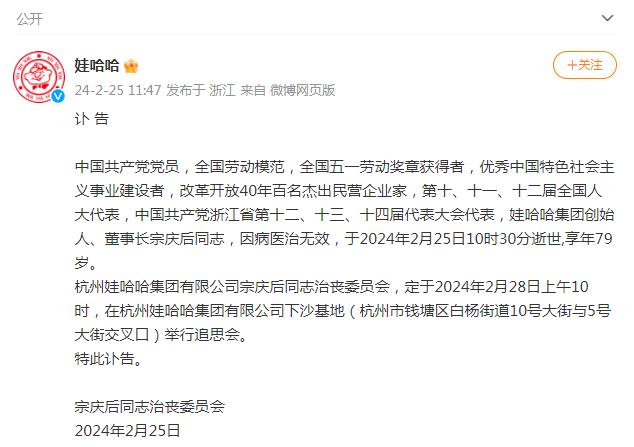 中新網(wǎng)2月25日電 據(jù)娃哈哈集團(tuán)官方微博消息,娃哈哈集團(tuán)創(chuàng)始人、董事長(zhǎng)宗慶后因病醫(yī)治無(wú)效,于2024年2月25日10時(shí)30分逝世,享年79歲。