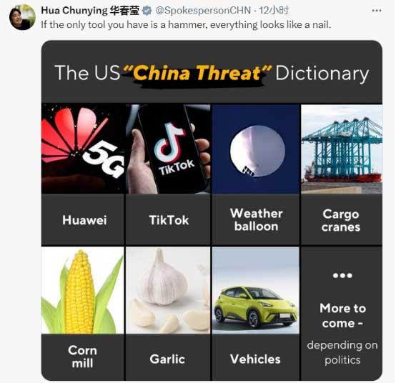 華春瑩最后回擊,“如果你唯一的工具是錘子,那么所有東西看起來都像釘子?!边@條帖文隨附圖片上,列出美國以往炒作“中國威脅”的詞典:包括華為,TikTok,氣象無人飛艇,起重機,玉米加工廠,大蒜,汽車……還有更多,取決于政治因素?!?/p>