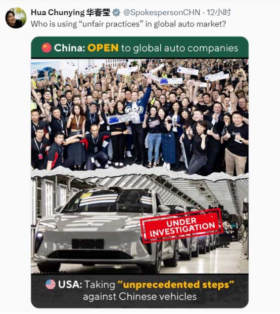 她隨后發(fā)表圖文,對比中美在汽車行業(yè)的行為問道,“是誰在全球汽車市場采取‘不公平做法’?”圖片顯示,中國的做法是“向全球車企”開放,而美國正針對中國汽車采取“前所未有的措施”?!?/p>