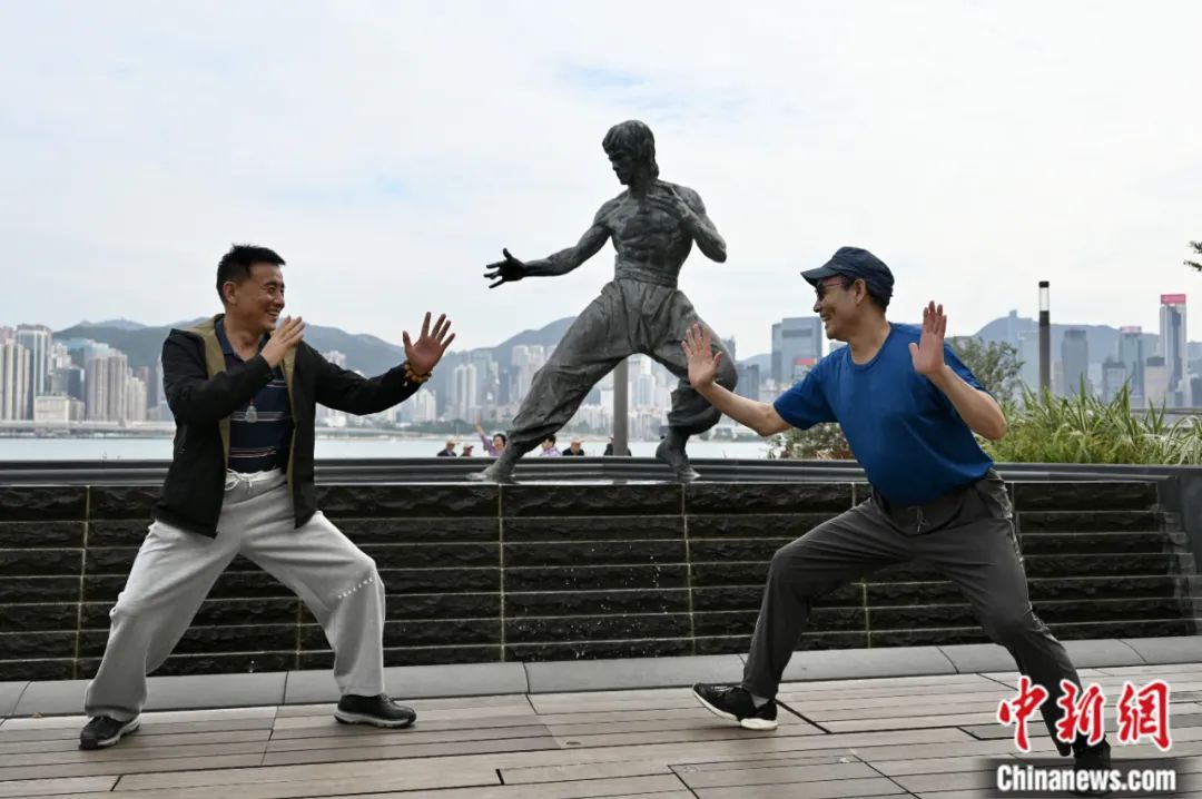 2023年11月,香港,游客擺出李小龍銅像的姿勢(shì)合影。李志華 攝