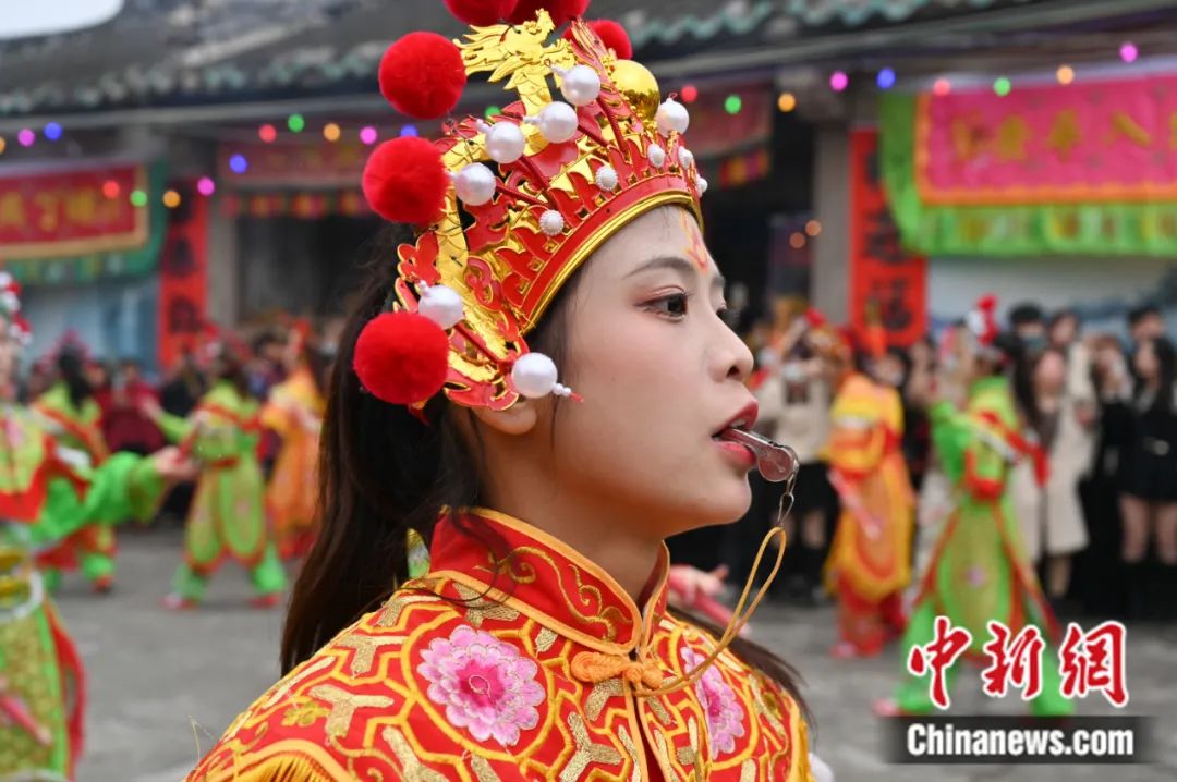 2023年2月9日,廣東潮州,潮陽(yáng)西門(mén)女子英歌隊(duì)亮相仙都鄉(xiāng)媽祖文化巡游活動(dòng)。陳楚紅 攝