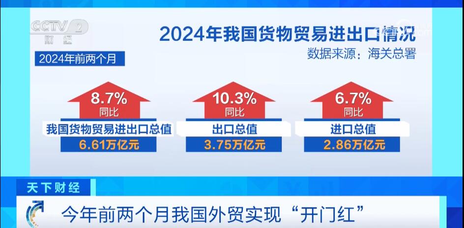 今年前2個(gè)月,我國(guó)貨物貿(mào)易進(jìn)出口總值6.61萬億元,同比增長(zhǎng)8.7%。其中,出口3.75萬億元,同比增長(zhǎng)10.3%;進(jìn)口2.86萬億元,同比增長(zhǎng)6.7%。