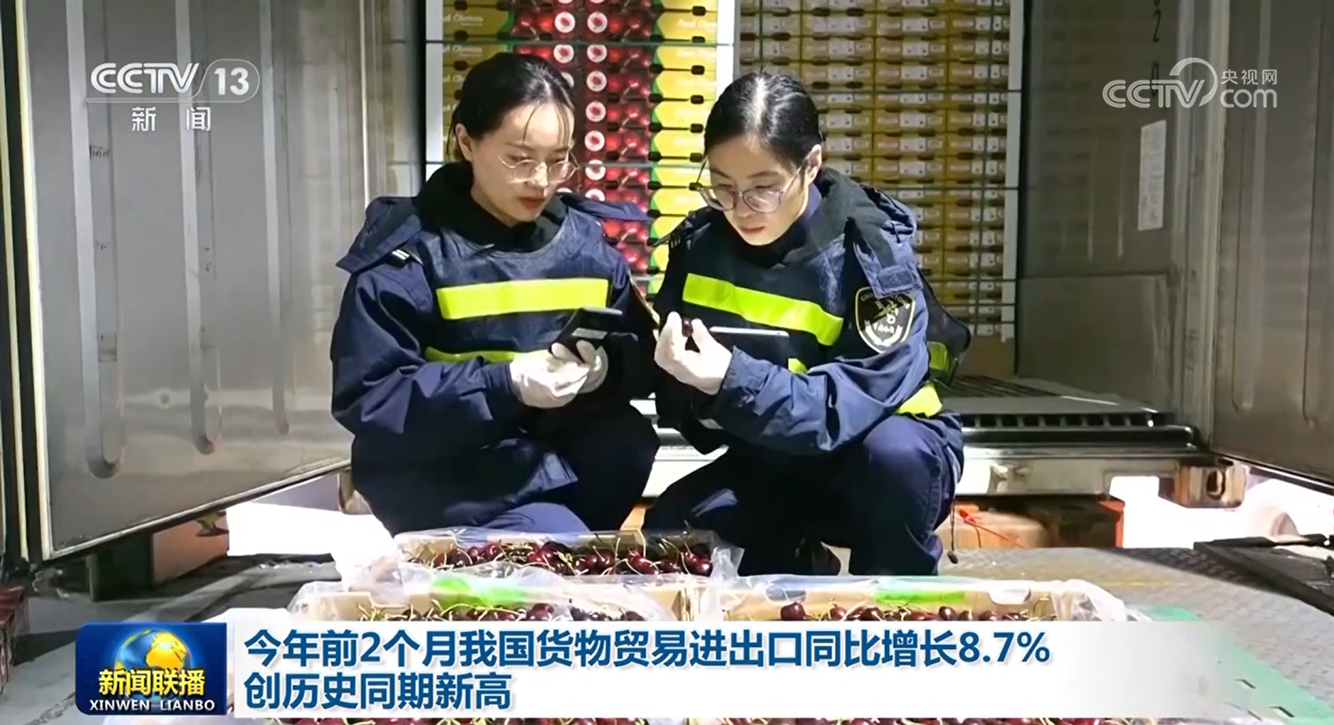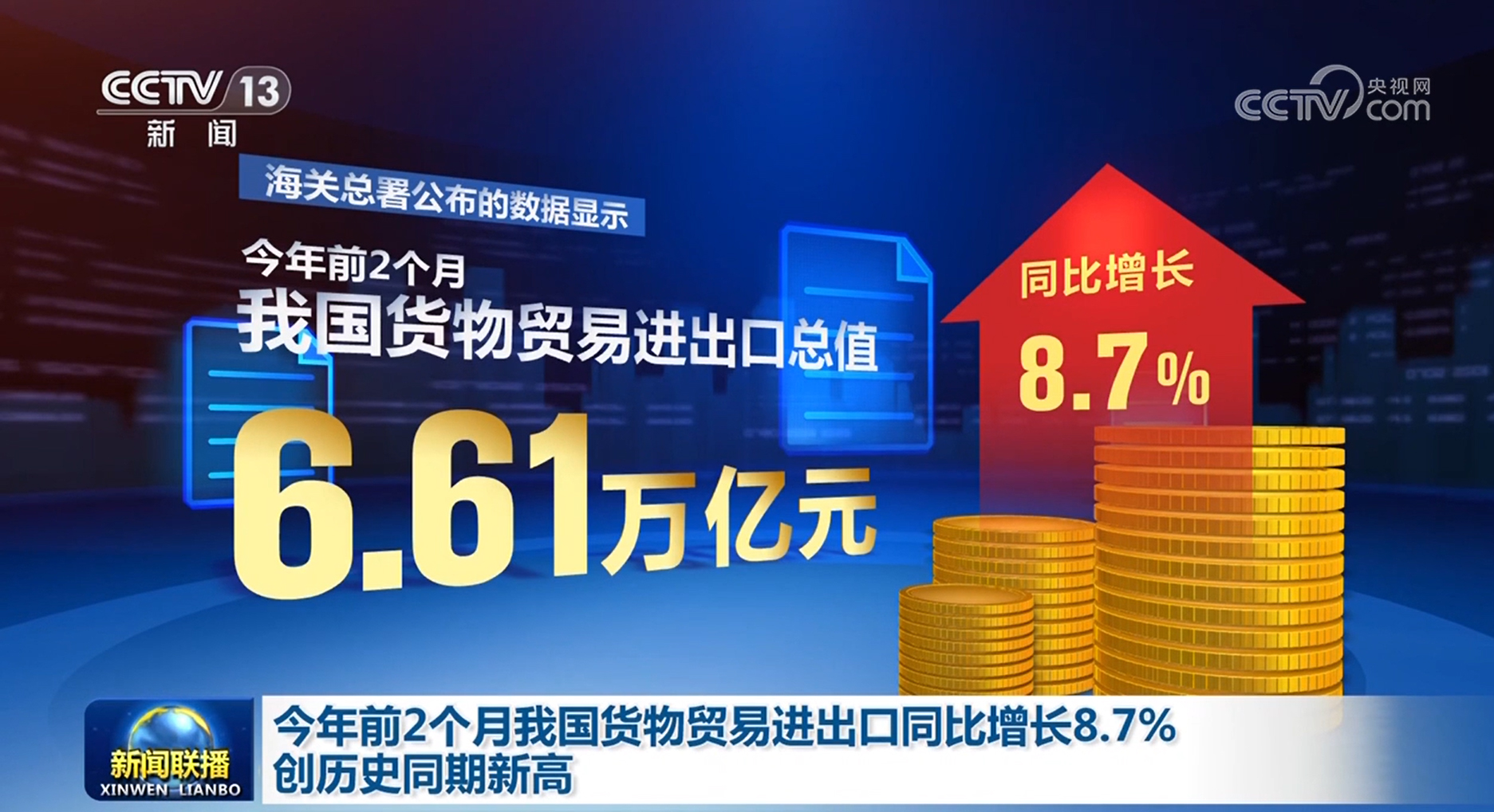 央視網(wǎng)消息(新聞聯(lián)播):記者今天(3月7日)從海關(guān)總署獲悉,今年前2個(gè)月,我國貨物貿(mào)易進(jìn)出口規(guī)模創(chuàng)歷史同期新高,外貿(mào)實(shí)現(xiàn)良好開局。