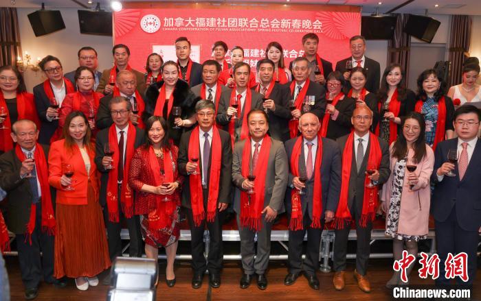 當(dāng)?shù)貢r間3月8日晚,加拿大福建社團(tuán)聯(lián)合總會在多倫多舉辦2024甲辰龍年迎春團(tuán)拜會。圖為該會理事會成員與主要嘉賓共同祝酒。 中新網(wǎng)記者 余瑞冬 攝