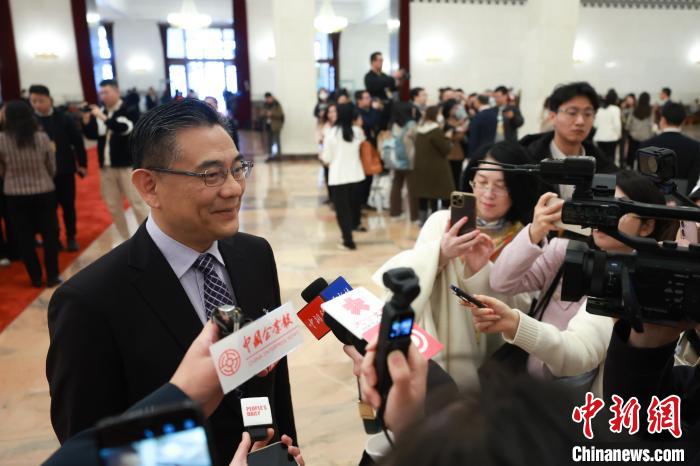 3月8日,十四屆全國人大二次會(huì)議在北京人民大會(huì)堂舉行第二次全體會(huì)議。圖為會(huì)后,港區(qū)全國人大代表?xiàng)畹卤蠼邮苊襟w采訪?!≈行律缬浾?蔣啟明 攝