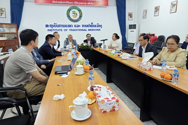 老撾衛(wèi)生傳統(tǒng)醫(yī)藥研究院黨委書記,院長Dr. Bounleuane Douangdeuane、老撾衛(wèi)生熱帶醫(yī)學與公共衛(wèi)生研究院創(chuàng)始院長Prof.Dr.Boungnong Boupha、張秋利博士商談合作具體事宜