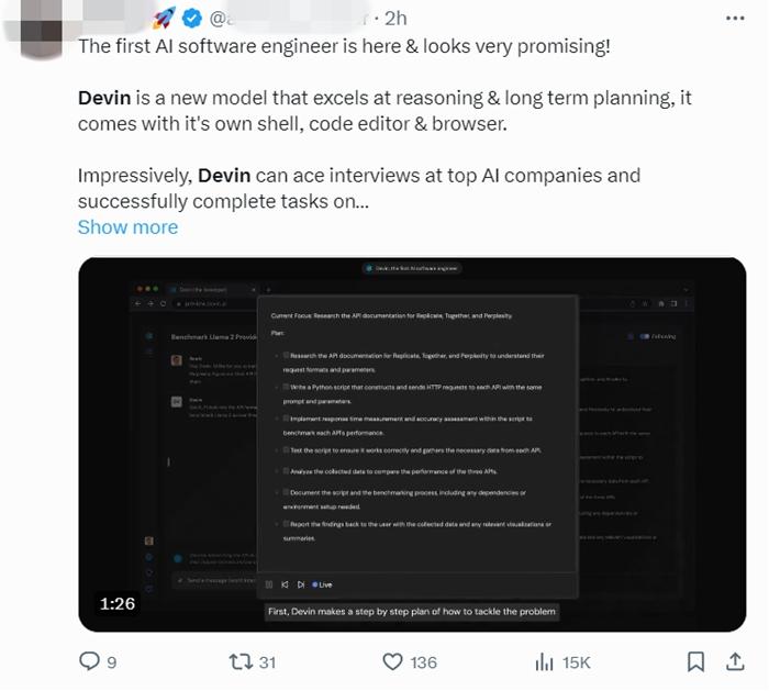 “第一位AI工程師看起來很有希望,令人印象深刻的是,Devin可以在頂級AI公司的面試中脫穎而出,并且成功地完成了任務?!庇腥斯ぶ悄軐<以谏缃黄脚_分享觀點。多個Devin編程的視頻也在網(wǎng)絡流傳。