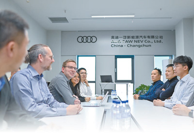 近年來(lái),許多外國(guó)專(zhuān)家感受到發(fā)展機(jī)遇,來(lái)到中國(guó)安居樂(lè)業(yè)。圖為德國(guó)工程師薩沙(左三)與妻子約翰娜(左四)在位于吉林長(zhǎng)春的奧迪一汽新能源汽車(chē)有限公司會(huì)議室開(kāi)會(huì)。