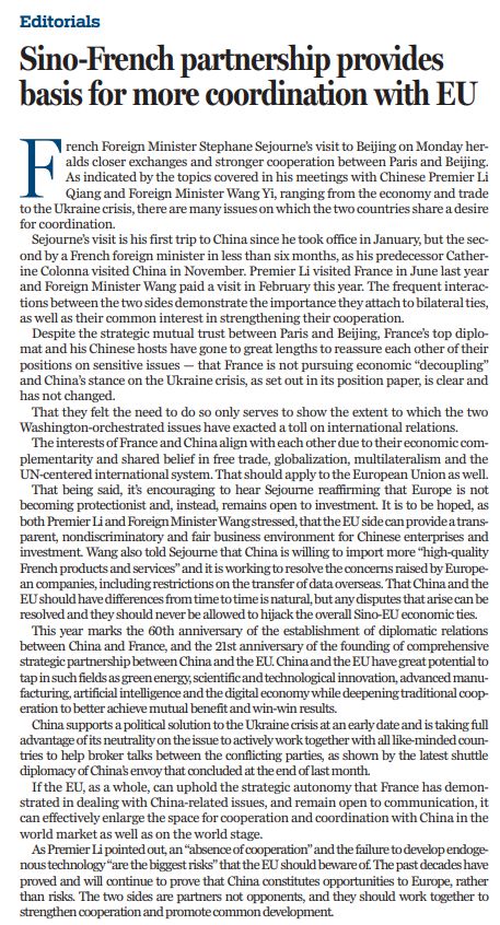 今年是中法建交60周年,也是中歐建立全面戰(zhàn)略伙伴關(guān)系21周年。中歐在綠色能源、科技創(chuàng)新、先進制造、人工智能、數(shù)字經(jīng)濟等領(lǐng)域大有可為,同時也要深化傳統(tǒng)合作,更好實現(xiàn)互利共贏。