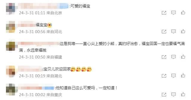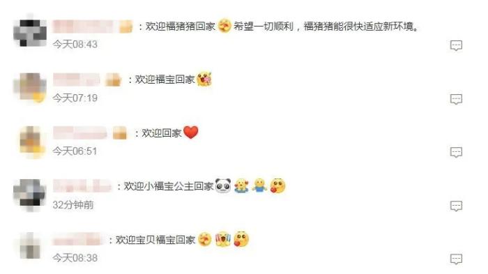 有網(wǎng)友寫道,祝愿“福寶”一切順利,“能很快適應新環(huán)境”。還有網(wǎng)友表示,“福寶回國后一定也要福氣滿滿,永遠幸福哦!”