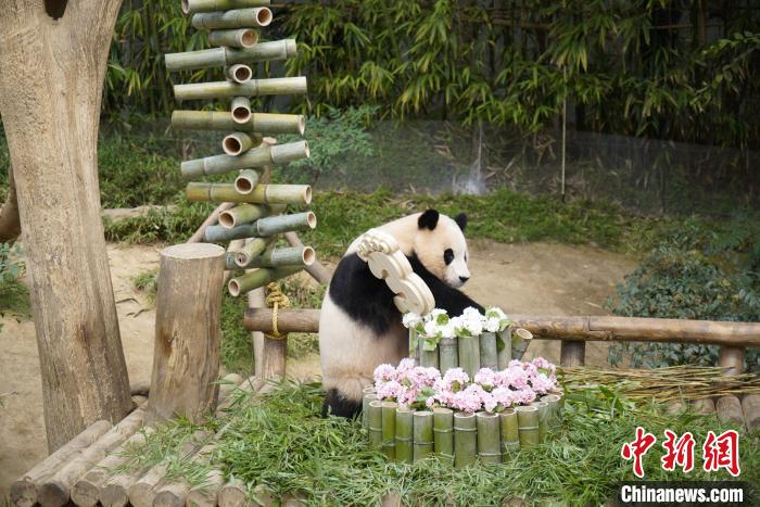 2023年7月20日,旅韓大熊貓“福寶”迎來(lái)三周歲生日。三星愛(ài)寶樂(lè)園為“福寶”舉行生日會(huì)慶生。圖為“福寶”和它的竹子“蛋糕”。 中新網(wǎng)記者 劉旭 攝