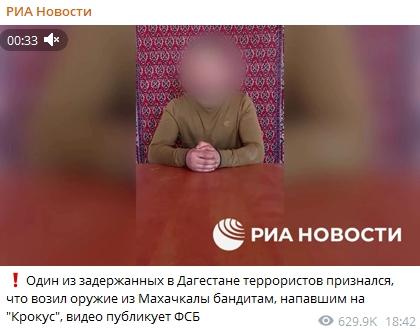 “我給那些襲擊了莫斯科‘克羅庫斯城’音樂廳的人帶去了武器。武器是我從馬哈奇卡拉帶到梅季希的?!逼渲幸蝗吮硎?。