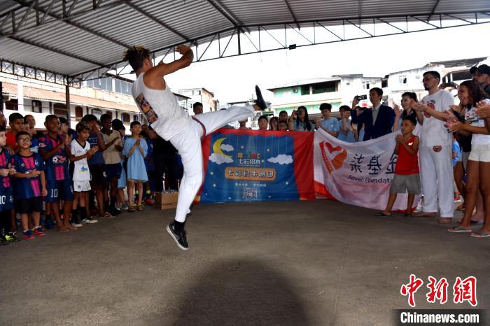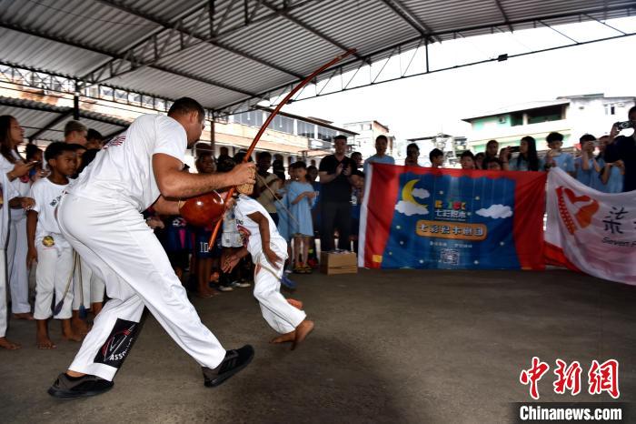 當(dāng)?shù)貢r(shí)間3月23日,巴西里約熱內(nèi)盧石頭河社區(qū),巴西“戰(zhàn)舞”舞者為來(lái)自加拿大的華僑華人小朋友表演?!≈行律缬浾?林春茵 攝