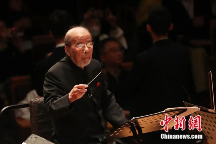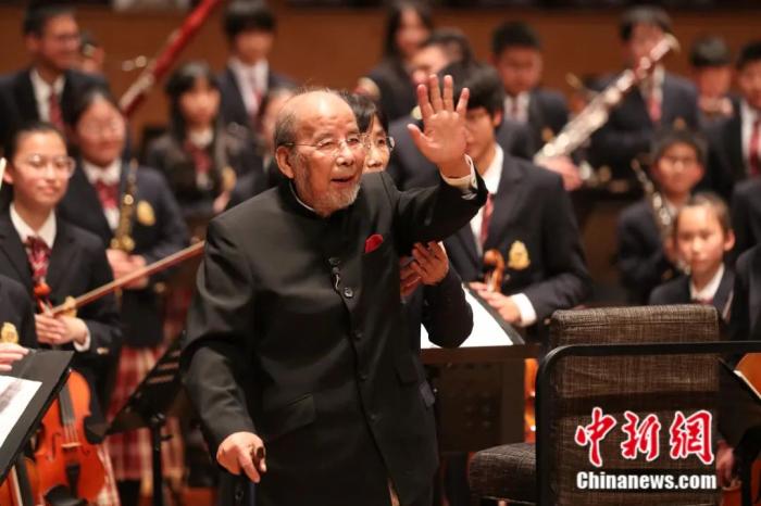 音樂(lè)會(huì)的尾聲,99歲高齡的中國(guó)著名指揮家曹鵬在長(zhǎng)達(dá)一分半的掌聲中登上指揮臺(tái)。