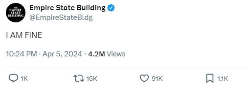 地震發(fā)生幾分鐘后,紐約地標(biāo)建筑帝國(guó)大廈的官方社交媒體賬號(hào)發(fā)文稱(chēng):“我很好”。