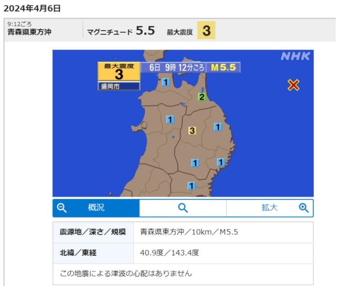 中新網(wǎng)4月6日電 據(jù)日本廣播協(xié)會(NHK)報道,當(dāng)?shù)貢r間6日9時12分,日本青森縣海域發(fā)生5.5級地震,震源深度10千米。