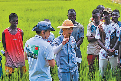 中國(guó)農(nóng)業(yè)專家為科特迪瓦農(nóng)民進(jìn)行水稻病蟲(chóng)防治的培訓(xùn)。