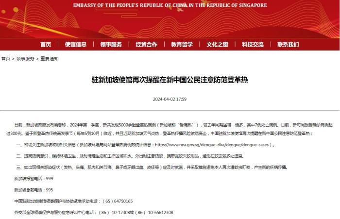 目前,新每周報(bào)告確診病例超300例,鑒于新登革熱傳統(tǒng)高發(fā)季節(jié)(每年5到10月)臨近,并且近期新加坡天氣炎熱,登革熱傳播風(fēng)險(xiǎn)高企,駐新加坡使館提醒在新中國(guó)公民注意防范登革熱: