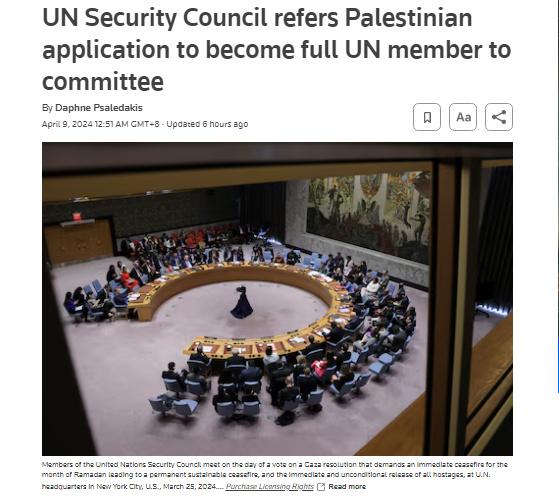 中新網(wǎng)4月9日電 據(jù)路透社報道,當(dāng)?shù)貢r間4月8日,聯(lián)合國安理會將巴勒斯坦成為聯(lián)合國正式會員國的申請?zhí)峤话怖頃鲁蓡T接納委員會。