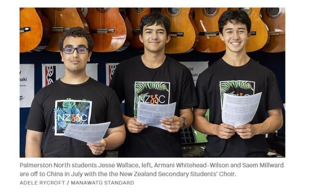 圖為將來中國參加合唱節(jié)的3名新西蘭學(xué)生。圖片來源于新西蘭Stuff網(wǎng)站截圖