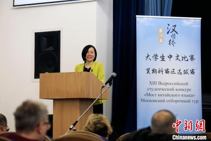 4月12日,中國駐俄使館教育處一等秘書鄧瀅出席第十三屆全俄“漢語橋”大學(xué)生中文比賽莫斯科賽區(qū)選拔賽并致辭。(中新網(wǎng)記者 田冰 攝)