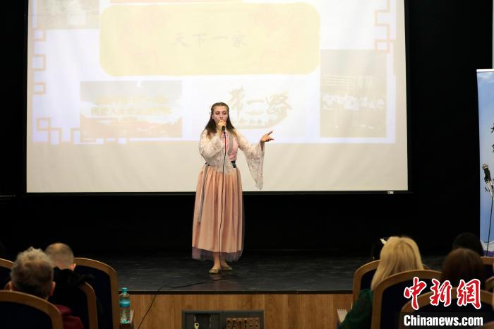 4月12日,第十三屆全俄“漢語橋”大學(xué)生中文比賽莫斯科賽區(qū)選拔賽在莫斯科國立語言大學(xué)舉行。圖為參賽選手進行主題演講。(中新網(wǎng)記者 田冰 攝)
