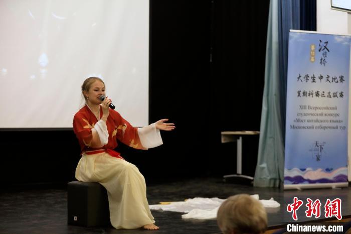 4月12日,第十三屆全俄“漢語橋”大學(xué)生中文比賽莫斯科賽區(qū)選拔賽在莫斯科國立語言大學(xué)舉行。圖為參賽選手在“中華文化技能”比賽環(huán)節(jié)。(中新網(wǎng)記者 田冰 攝)