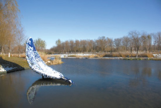 在通州區(qū)城市綠心森林公園的水系中,也有一件為冬奧會新創(chuàng)作的公共藝術(shù)作品《舟》。它看起來如同一葉代表“同舟共濟”的輕舟,也像一根羽毛、一片象征著和平與友誼的橄欖葉。走近仔細看,雕塑由許多鵝卵石般的陶瓷顆粒組成。它由中國藝術(shù)研究院雕塑家張冕、郅敏合作,是北京冬奧會公共藝術(shù)作品征集活動評選出的最佳作品之一。