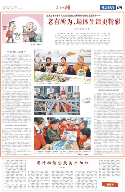 老年人在言傳身教、化解矛盾、傳幫帶等方面具有獨特優(yōu)勢。隨著中國人口人均壽命延長和健康狀況改善,越來越多的老年人由過去退休在家休閑娛樂、頤養(yǎng)天年,轉為繼續(xù)參與社會服務和建設。如今,無論是科技、教育、醫(yī)療衛(wèi)生領域,還是大街小巷的志愿服務站點,都活躍著大批退休老人的身影,他們在“老有所為”中找到新的價值和樂趣,活出了老年人的精彩。