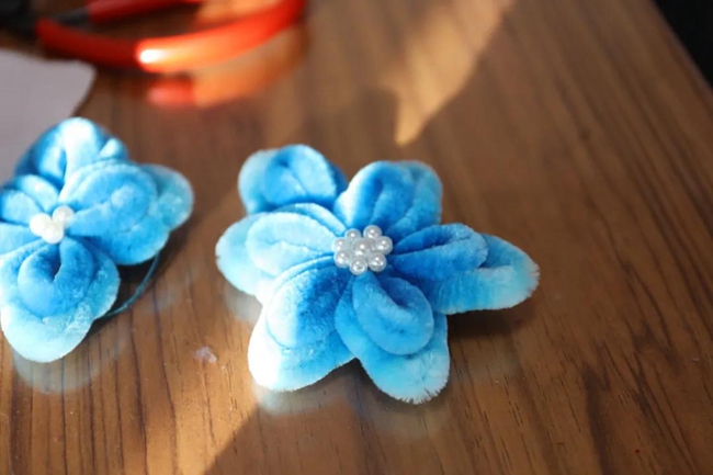除此之外,一朵絨花制作過程需要經歷六七道工序,每一道都非常關鍵,一點馬虎不得。不僅要確保單獨花朵制作精良,所有絨花大小、顏色、造型整體效果也要統(tǒng)一,對于技師們來說,過程中每一個細節(jié)都很重要。制作完成后的絨花,為了達到飽滿,圓潤的效果,以及方便上帽縫制,還會進行反復修剪。這樣一顆顆寶相花才是最有“中國味兒”的。
