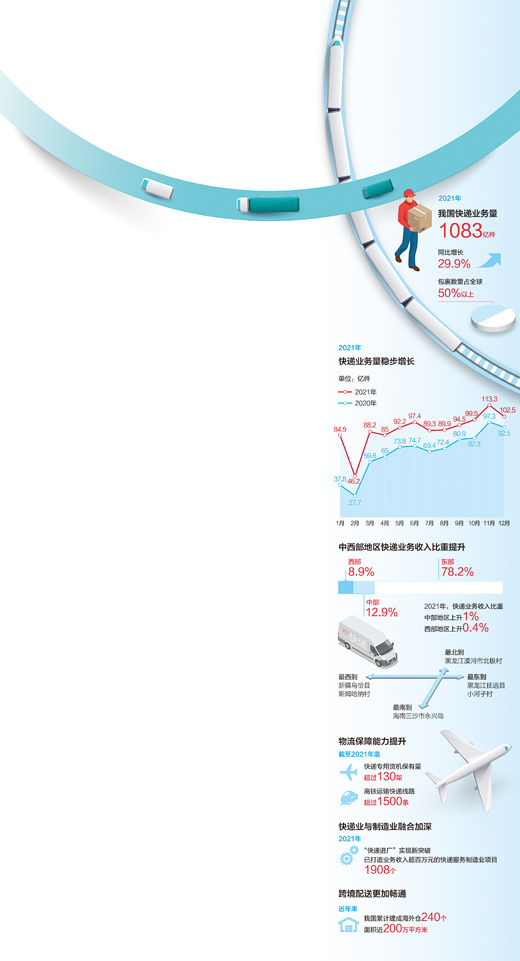 快遞業(yè)既貫通生產(chǎn)、分配、流通、消費各環(huán)節(jié),又關(guān)聯(lián)一二三各產(chǎn)業(yè)。2021年,我國快遞業(yè)務量達1083億件,同比增長29.9%??爝f業(yè)蓬勃發(fā)展,不僅有利于制造業(yè)通過兩業(yè)融合實現(xiàn)降本增效,更在走出去的步伐中助力“國貨出?!?,支撐跨境商品流動更便利,為行業(yè)內(nèi)外帶來更多機遇。