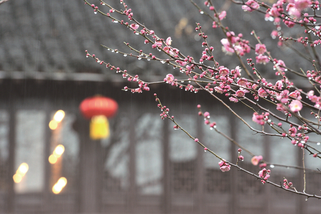 1月23日下午,嘉興市區(qū)梅灣街,冬雨中幾株紅梅迎春開放,競相爭艷。(徐志達(dá))